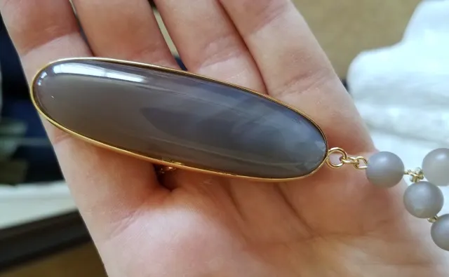 I did peek at my box after it shipped. When i saw this necklace, I wasn’t interested. But then I tried it on and fell in love with it! The pendant piece is large and very smooth and it’s almost relaxing to just rub it. lol