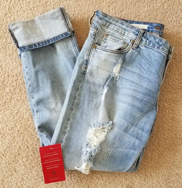 I’ve officially lost track of how many times I’ve been sent the KFTK Catherine Boyfriend jeans. i send them back every single time. They just don’t fit me. I don’t know if it is because they are slimmer through the hips, but the normal size I wear in KFTK, and a size up, aren’t even close to fitting. I really want a pair of distressed jeans tho!