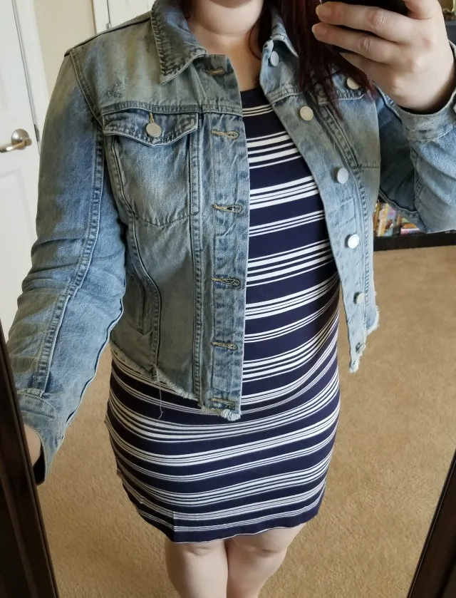 Here’s another item I keep getting and keep returning. The navy and white striped tunic dresses. This one is probably the best out of all the ones I have tried on. The different sizes in the stripes do more for my figure than the others. But I have a big butt and wide hips. Stripes from head to toe (or knee) just don’t work for me.